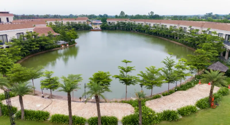 The bird’s-eye view reveals its heart — a stunning central pool area framed by artistic pavilions and premium suites, each detail crafted to perfection. The turquoise blue waters shimmer under the open sky, offering a perfect escape for those seeking relaxation or an indulgent weekend retreat. The surrounding lush gardens and palm-lined walkways weave a natural harmony, enhancing the resort’s resort-style calm.